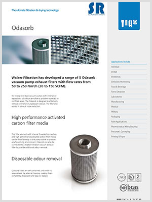 Walker Filtration公司開發(fā)了專用于安裝在真空泵排氣口的Odasorb系列真空泵排氣口過濾器,根據(jù)最大處理流量的不同,Odasorb系列真空泵排氣口過濾器共分為5種型號,流量范圍從50Nm3/h至250 Nm3/h,接口尺寸有3/4”、1”、1 1/4”、 1 1/2”、 2”,過濾器的重量從0.76kg至1.20kg。