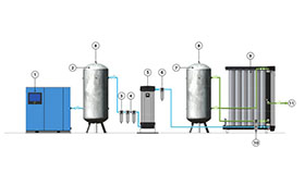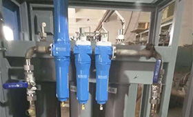 制氮機(jī)生產(chǎn)氮?dú)獾脑斫馕觯簝膳懦蓪?duì)的裝滿碳分子篩(CMS)的壓鑄鋁筒通過(guò)上下的均氣上蓋和底座連成整體,形成一個(gè)雙套分離系統(tǒng)。壓縮空氣通過(guò)底部的均氣底座進(jìn)入“在線”系統(tǒng),在碳分子篩間流動(dòng),其中的氧氣被碳分子篩優(yōu)先吸附,而氮?dú)鈩t可以順利通過(guò)碳分子篩。整個(gè)分離系統(tǒng)每隔一段時(shí)間(預(yù)設(shè)),控制系統(tǒng)自動(dòng)切換
