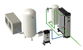 NANO GEN2高純度制氮機(jī)根據(jù)變壓吸附原理(PSA)從潔凈的壓縮空氣中持續(xù)分離出氮氣。兩排成對的裝滿碳分子篩(CMS)的壓鑄鋁筒通過上下的均氣上蓋和底座連成整體,形成一個雙套分離系統(tǒng)